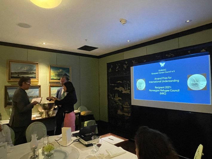 The first ever Arvand Prize for International Understanding was awarded to Norwegian Refugee Council (NRC) during an exclusive dinner event of EUIRANC at China Club Berlin on 15 September 2022. The silver medal was accepted by NRC’s country director in Germany Per Byman on behalf of the Iran country director Filip Lozinski.