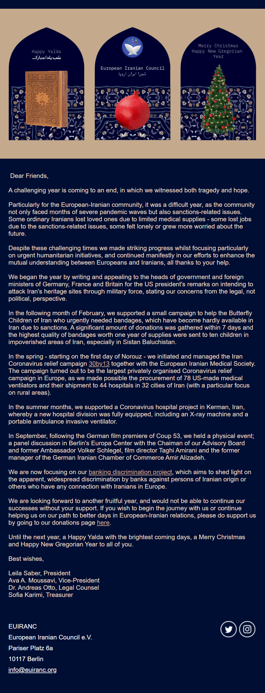 Please see below a link to the European Iranian Medical Society’s (EIMS) campaign report on the Iran Coronavirus Relief Fund 30by13, which EUIRANC executed together with EIMS.